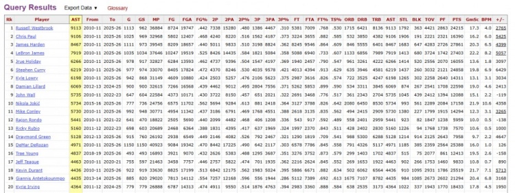 据统计,10-11赛季至今,威少以9124次助攻领跑全联盟,保罗(9106助)和哈登(8467助)分列二三位。