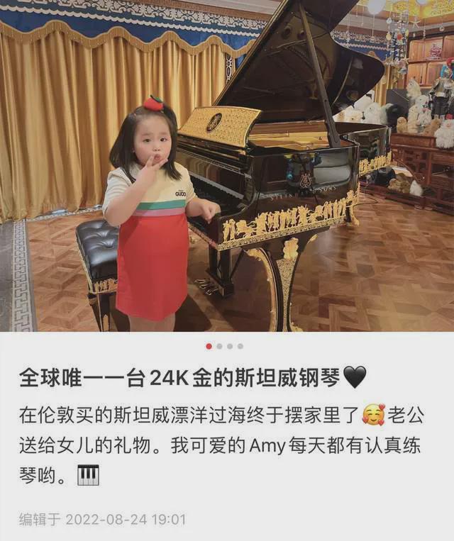 • 她曾晒出送给女儿的礼物——一架全球唯一、价值700万元的24K纯金斯坦威钢琴,金光璀璨。